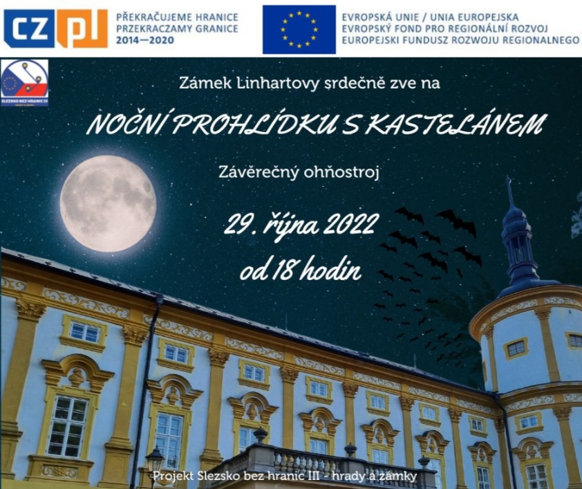 Dne 29. října mohli milovníci zámku v Linhartovech navštívit Zámecký jarmark. Zámeckým parkem v Linhartovech se po celý den nesla vůně vánočního punče, svařeného vína, trdelníků, langošů a dalších pochutin. Návštěvníci si mohli projít nespočet stánků s různými suvenýry, květinových stánků, dále stánků s vánočními dekoracemi, adventními věnci, ozdobami, svíčkami, kosmetikou, sladkostmi, proutěnými výrobky a spoustou dalšího. Přítomné během dne bavili členové „Cirkusu trochu jinak“ v maskách babky a dědka. Návštěvníci si mohli prohlédnout kromě exteriéru také vnitřní nově zrekonstruované prostory zámku. Od 18 hodin se mohli zájemci účastnit také noční prohlídky zámku s kastelánem, kterou zdárně zakončil závěrečný ohňostroj. Děkujeme všem stánkařům a všem návštěvníkům za návštěvu a budeme se na vás těšit v další sezóně na jaře 2023 opět v Linhartovech.