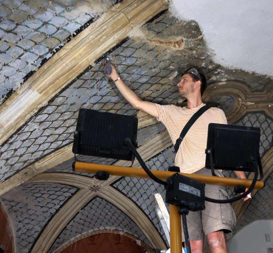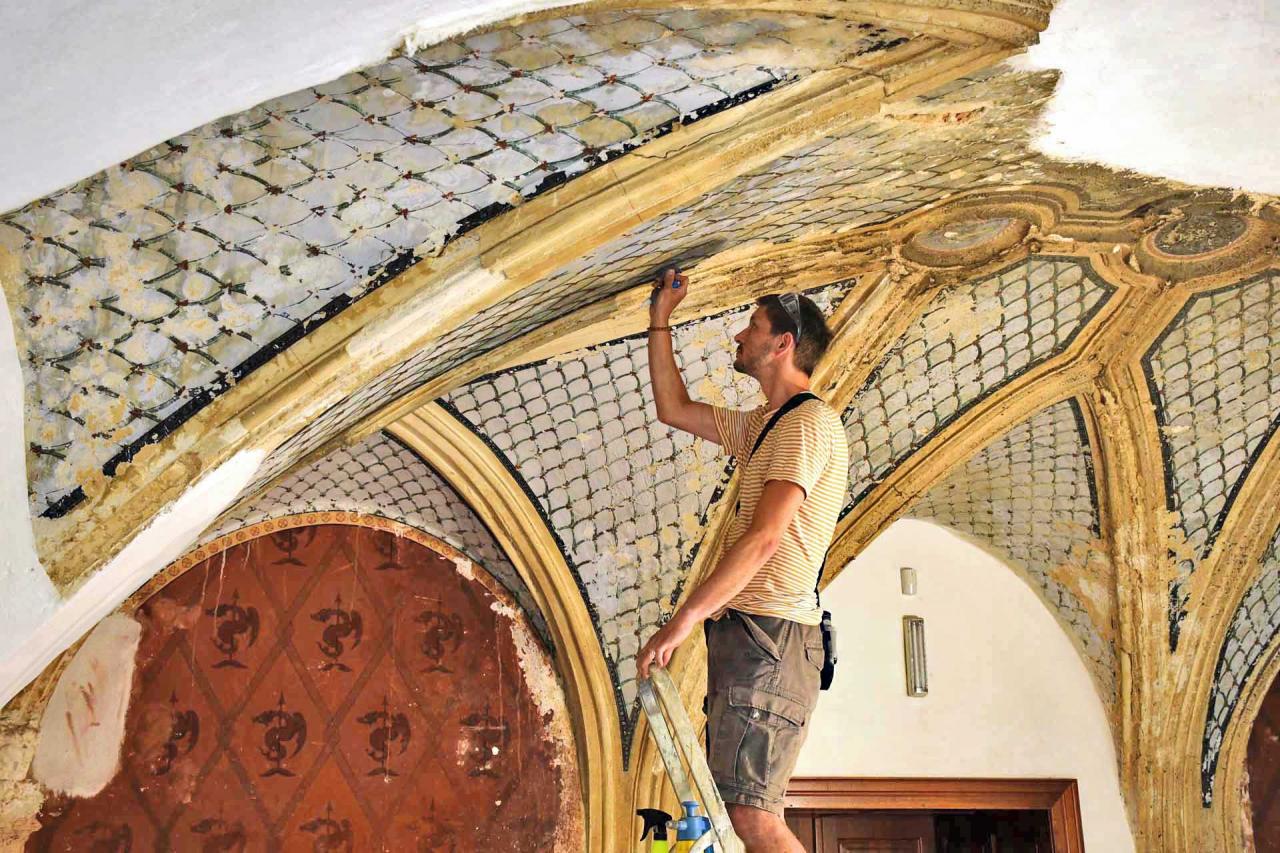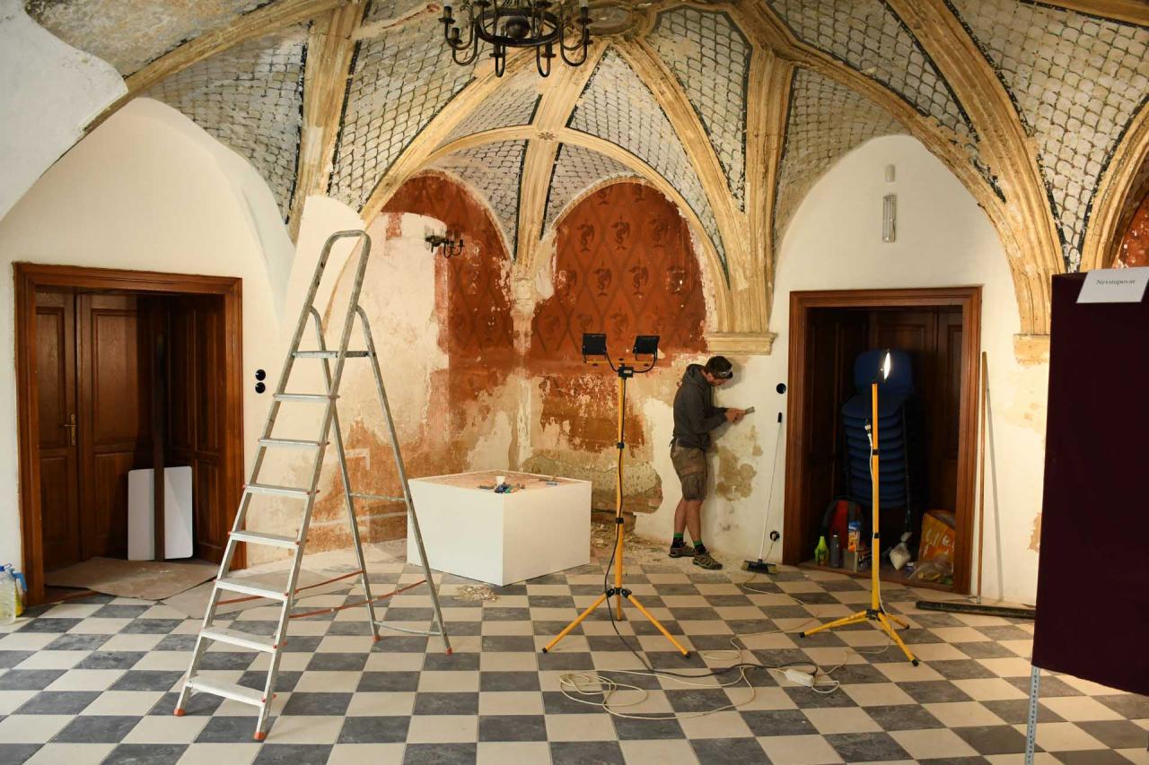V soklových partiích je lokálně odstraňována silně zavlhlá a degradovaná omítka, která není soudržná se starším omítkovým souvrstvím z dob středověké stavební fáze. V příštích letech by měly následovat další postupy (tmelení, barevné retuše a rekonstrukce maleb i štuků) v plném rozsahu dle schváleného restaurátorského záměru.