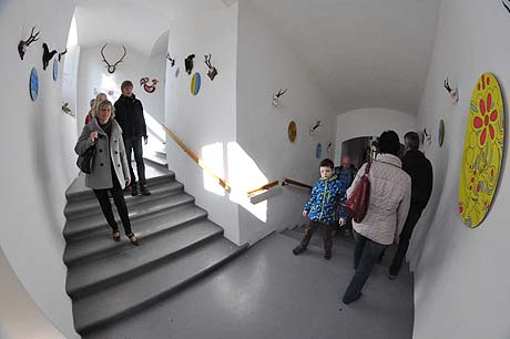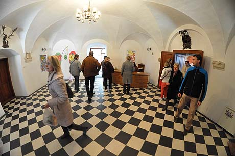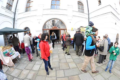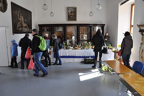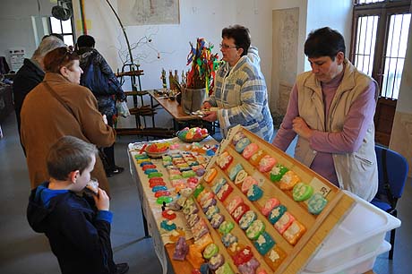 Tak se na stolech a lavicích v celém zámku, na jeho nádvoří i před zámkem v prodejních stáncích začaly objevovat věci více či méně související s Velikonocemi. Různobarevné kraslice zdobené mnoha technikami – malováním, frézováním, rytím nebo vyřezáváním.